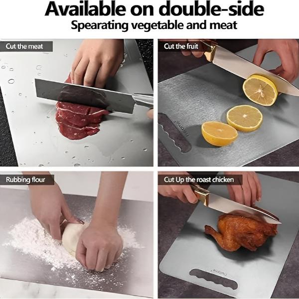 Hecha de acero inoxidable 100%, esta tabla de cortar resiste el desgaste y la rotura, prometiendo un uso a largo plazo sin degradarse.