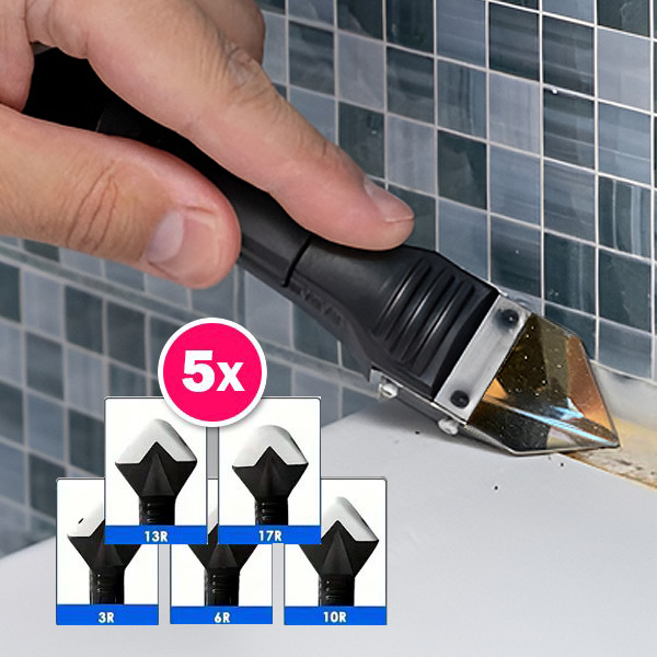 El kit de herramientas definitivo con 5 accesorios para eliminar silicona enmohecida, sellar y dar acabado a la lechada.